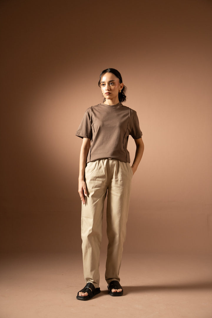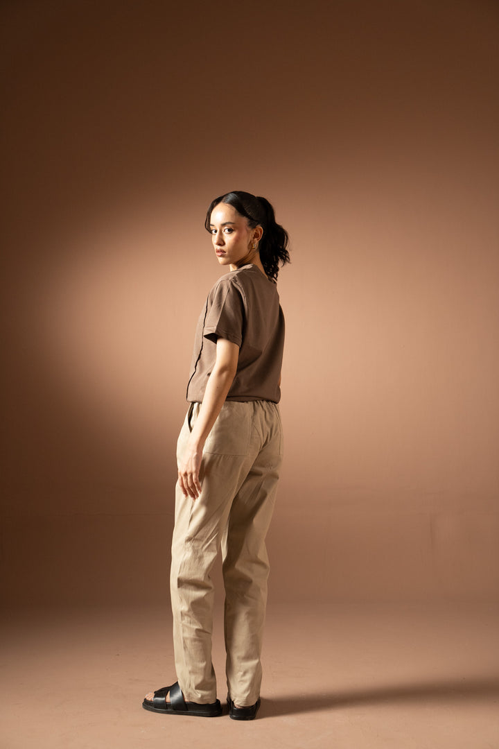 Beige straight-leg trousers with a relaxed fit and mid-rise waist. Comfortable and versatile for everyday style.