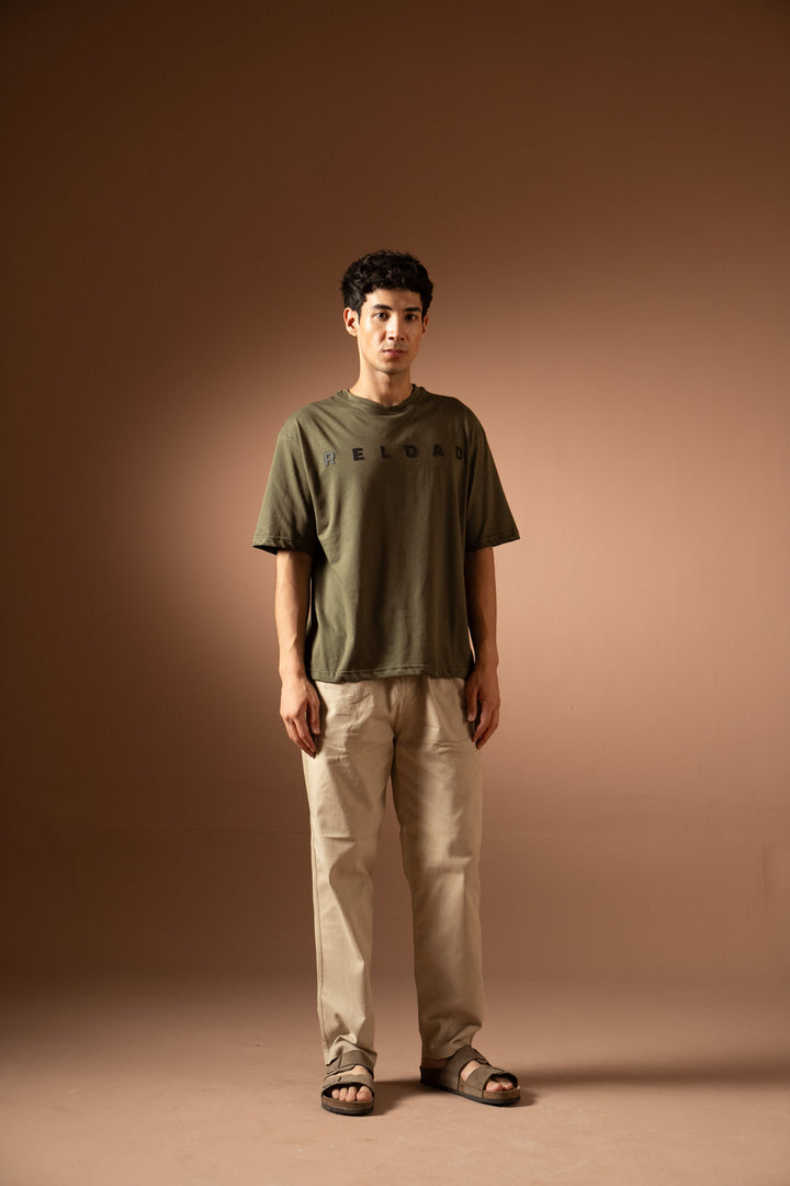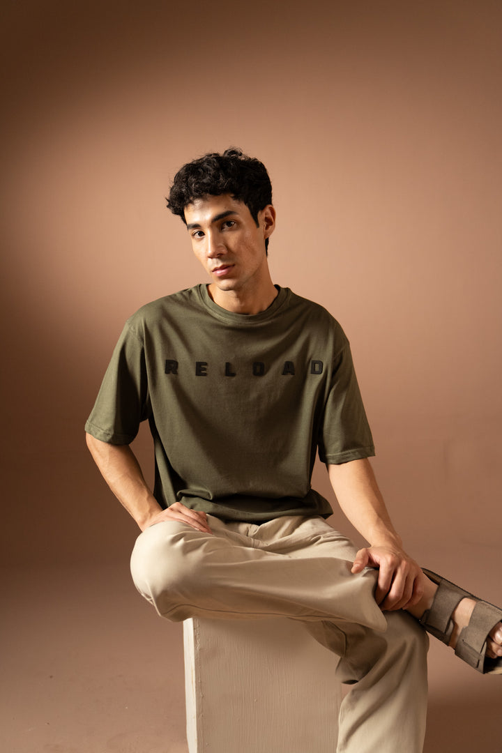 - A relaxed-fit olive green t-shirt with "RELOAD" graphic text. Lightweight, breathable, and perfect for casual wear.